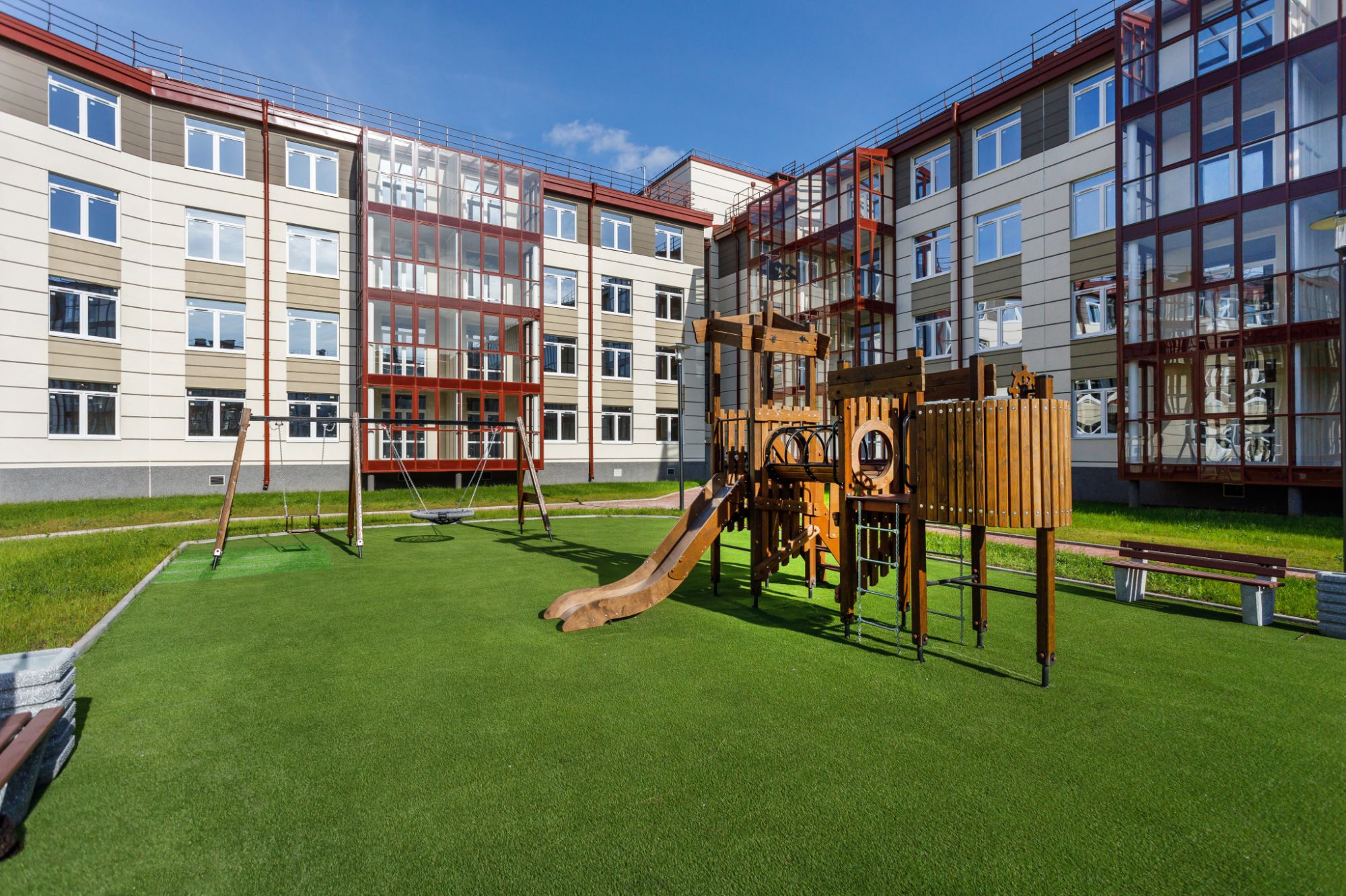 Многие ещё помнят, как играть в «испорченный телефон», «казаки-разбойники», «море волнуется раз», «съедобное-несъедобное», «колечко», «тише едешь - дальше будешь», «вышибалы». И, конечно, любимые игры советской детворы – «классики» и «резиночка». Если молодое поколение о таких дворовых развлечениях не слышало, расскажите правила и покажите, как играть. В современных дворах есть пространство для этих игр, тем более если они закрыты от проезда автотранспорта, а значит, более безопасны. Кроме того, в них появляются дополнительные возможности для игр и развития детей. Например, веревочные лазалки, как на детских площадках ЖК «Образцовый квартал 12» и «Образцовый квартал 13». Также во дворах малоэтажных комплексов есть безопасные качели, скамейки для отдыха, турники, которые делают свободное времяпровождение ещё интереснее. Здесь можно придумать свою игру, простой пример: догонялки по новым правилас: нельзя «салить» игрока, ноги которого не касаются земли. О безопасности детей здесь позаботились в первую очередь: высота конструкций небольшая, а в качестве покрытия на площадках используется искусственный газон, который смягчит удар при падении. Начиная седьмого жилого комплекса под брендом «Образцовые кварталы» реализована концепция «двор без машин». Проезд во двор предусмотрен только для транспорта экстренных служб.