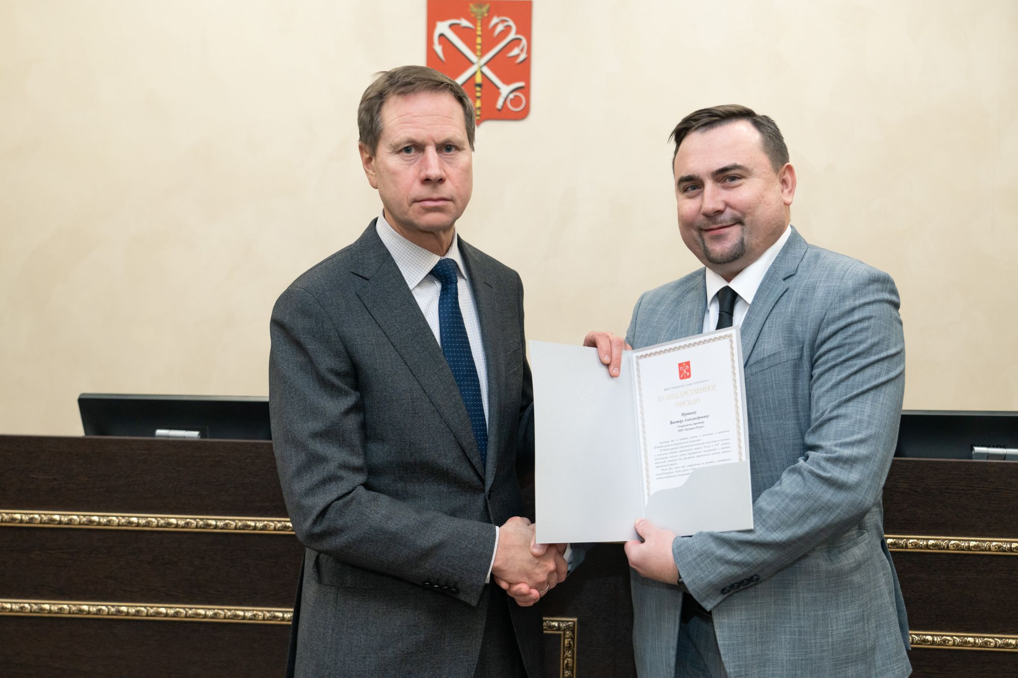 Генеральный директор специализированного застройщика «Терминал-Ресурс» Виктор Мурашёв получил благодарственное письмо от Правительства региона. Церемония награждения прошла в середине декабря в Комитете по Строительству Санкт-Петербурга.